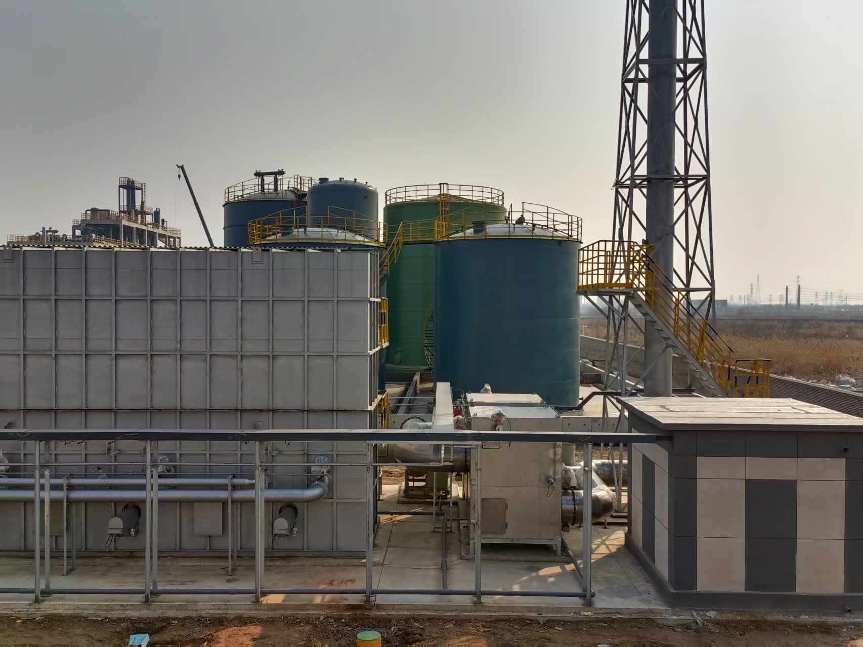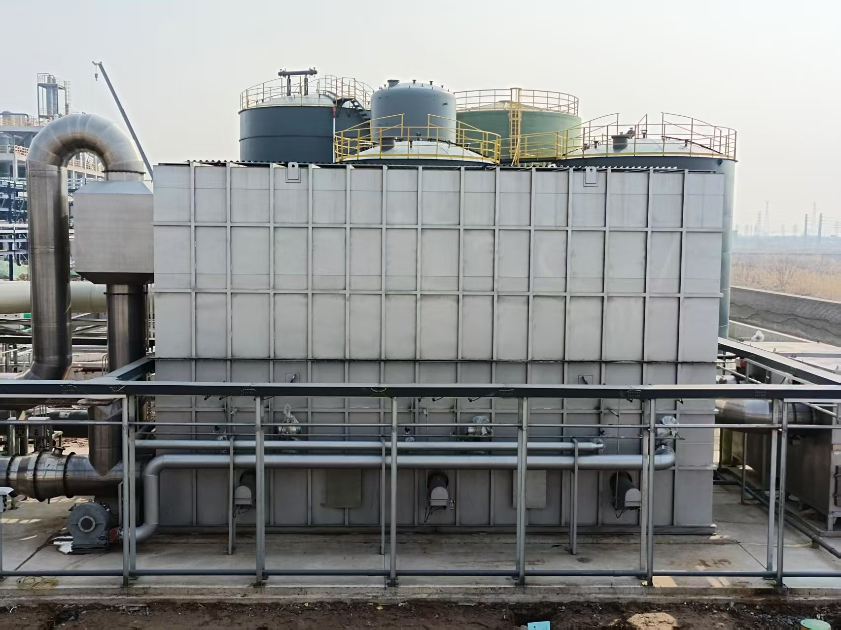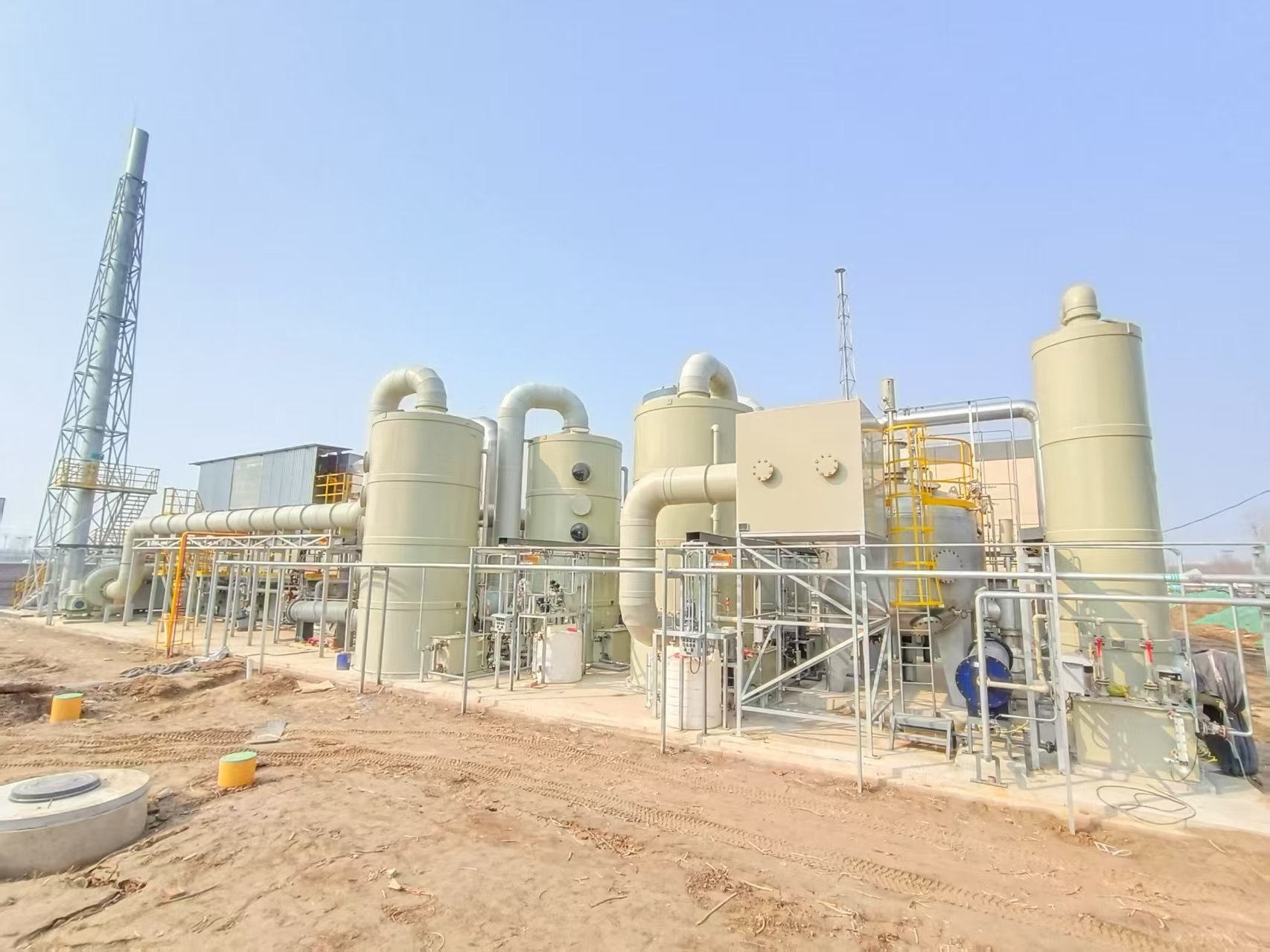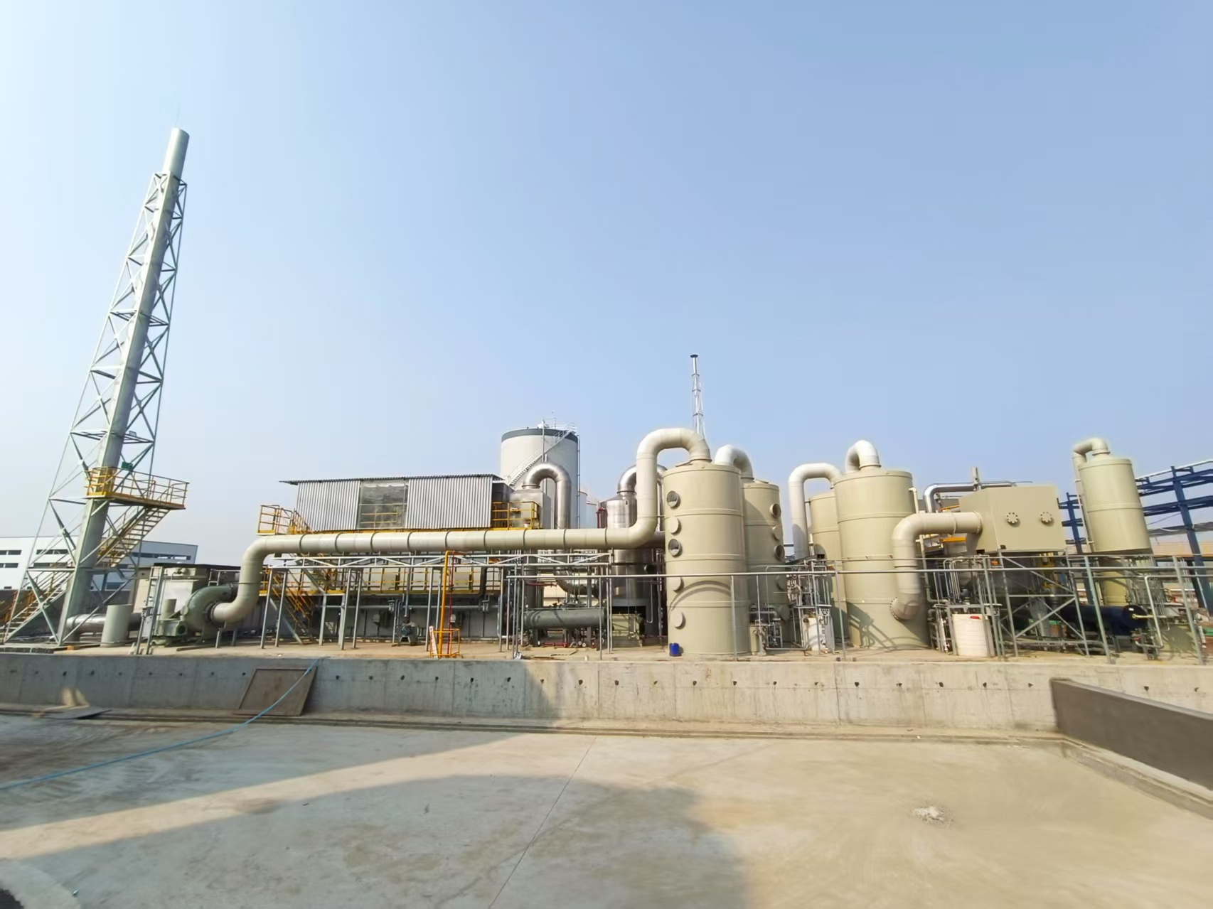 本項目車間廢氣處理工藝使用“前端預處理(甲供)→匯總深冷預處理(甲供)→匯總活性炭吸附預處理(甲供)→預處理堿洗塔→水封除霧設備→前引風機→阻火器→三室RTO→煙氣混合箱→一級急冷塔→二級堿洗塔→后端引風機→后處理活性炭箱→排氣筒排放”處理工藝。